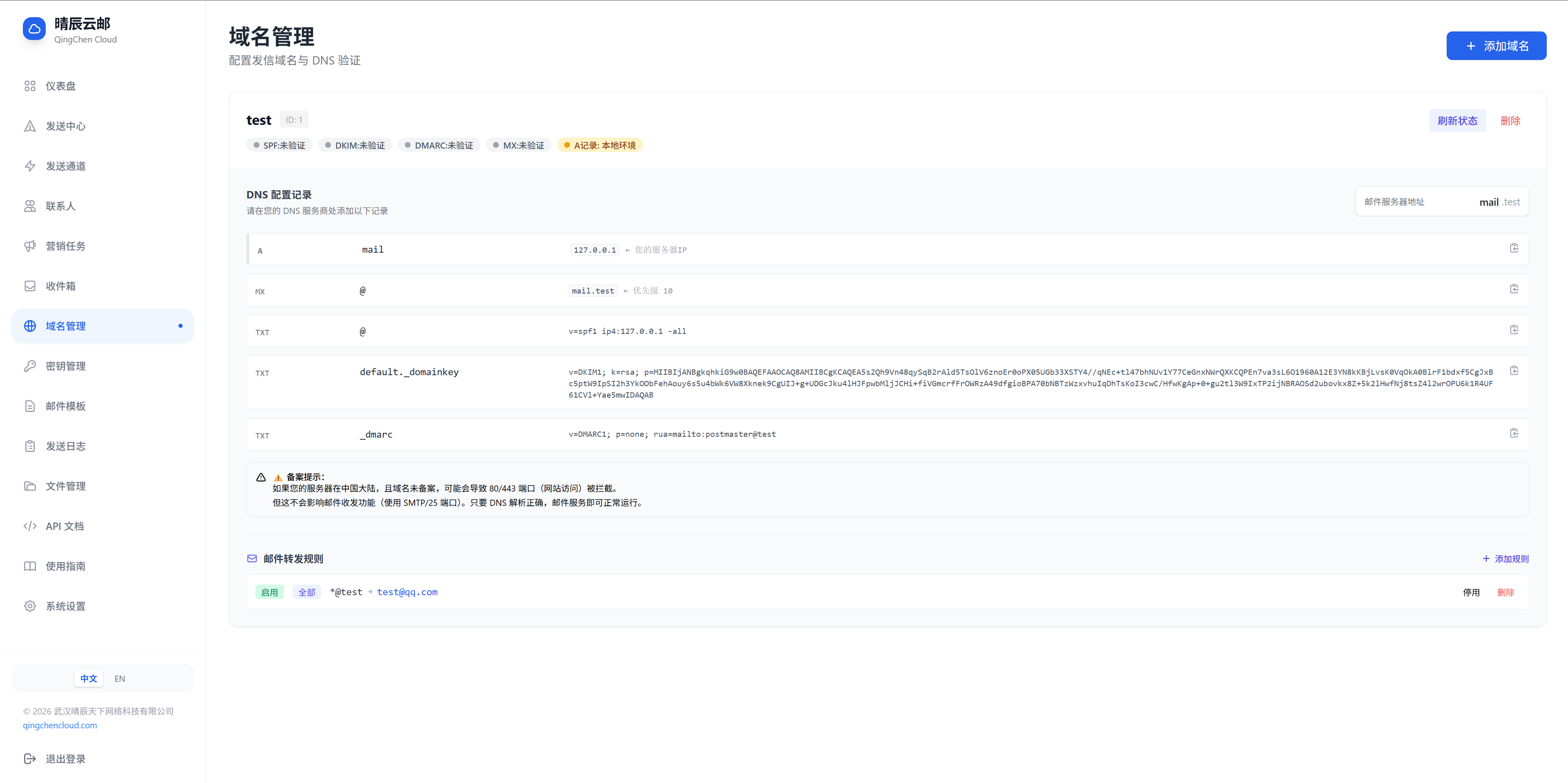 | 域名管理 | 多域名支持、DKIM 自动生成、DNS 验证 | ✅ |